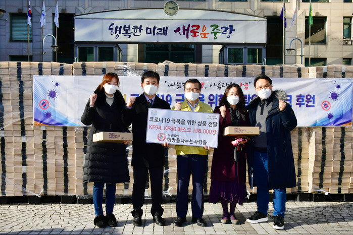 서울 중랑구는 20일 사단법인 희망을나누는사람들로부터 코로나19 극복을 위한 KF94·KF80 공적마스크(금 1억원 상당)를 전달받았다. 이 성품은 종합사회복지관·노인복지관 등에 배부될 예정이다. 사진은 전달식에서 류경기 구청장(가운데)이 관계자들과 기념촬영을 하는 모습. (사진제공=중랑구청)