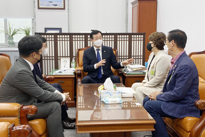 군용비행장 피해 공동대응을 위한 지방의회 전국연합회(이하 군지련)가 최근 국회를 방문해 군공항 소음 피해 지역의 소음등고선 기준 확대를 위한 법안 개정을 촉구했다. 이날 군지련 회장인 조명자 경기 수원시의원, 사무총장 김정렬 수원시의원, 이희승 수원시의원, 소음피해분과위원장 국강현 광주 광산구의원은 국회 민홍철 국방위원장을 만나 ‘소음대책지역 등고선 기준 확대를 위한 건의문’을 전달하고, 면담하는 자리를 마련했다. 사진은 군지련 소속 의원들이 민홍철 위원장과 의견을 나누고 있는 모습. (사진제공=수원시의회)