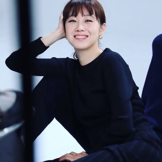사진 속 공효진은 '가장 보통의 연애' 포스터 촬영장으로 추정되는 장소에서 올블랙의 상하의를 입고 있다. 공효진은 김래원의 다리에 기대 환하게 웃고 있다.