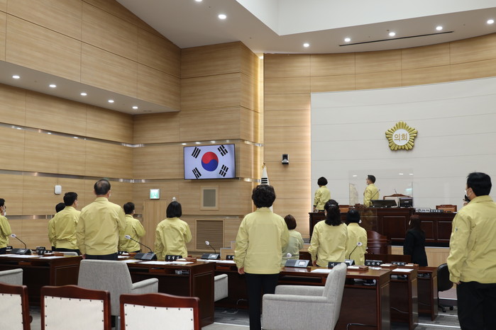 | ▲ 제262회 임시회 개회식에서 의원들이 국민의례를 하고 있다. (사진제공=용산구의회) |