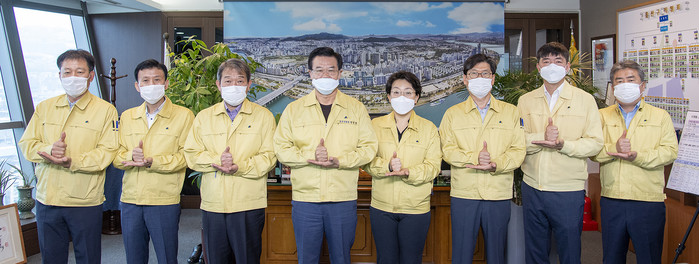 성장현 서울 용산구청장이 18일 구청장실에서 간부 공무원들과 함께 코로나19 극복에 힘쓰는 의료진을 격려하기 위한 '덕분에 챌린지' 캠페인에 동참했다. 사진은 성 구청장(왼쪽 네 번째)이 공무원들과 함께 엄지손가락을 치켜 세우며 의료진을 응원하는 모습. (사진제공=용산구청)