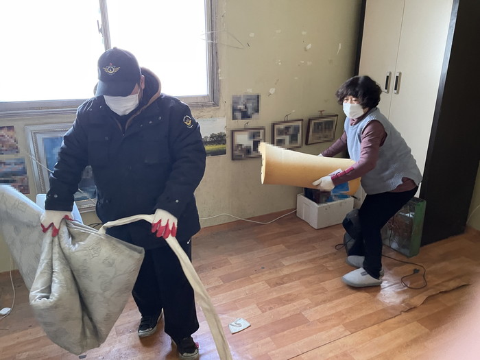 경기 동두천시 생연1동은 지난 19일 필요하지 않은 물건을 계속 쌓아두고, 처분하지 못하는 치매노인 가정을 방문해 쌓여 있는 폐기물을 정리했다. 사진은 이날 생연1동 관계자들이 폐기물을 치우고 있는 모습. (사진제공=동두천시청)