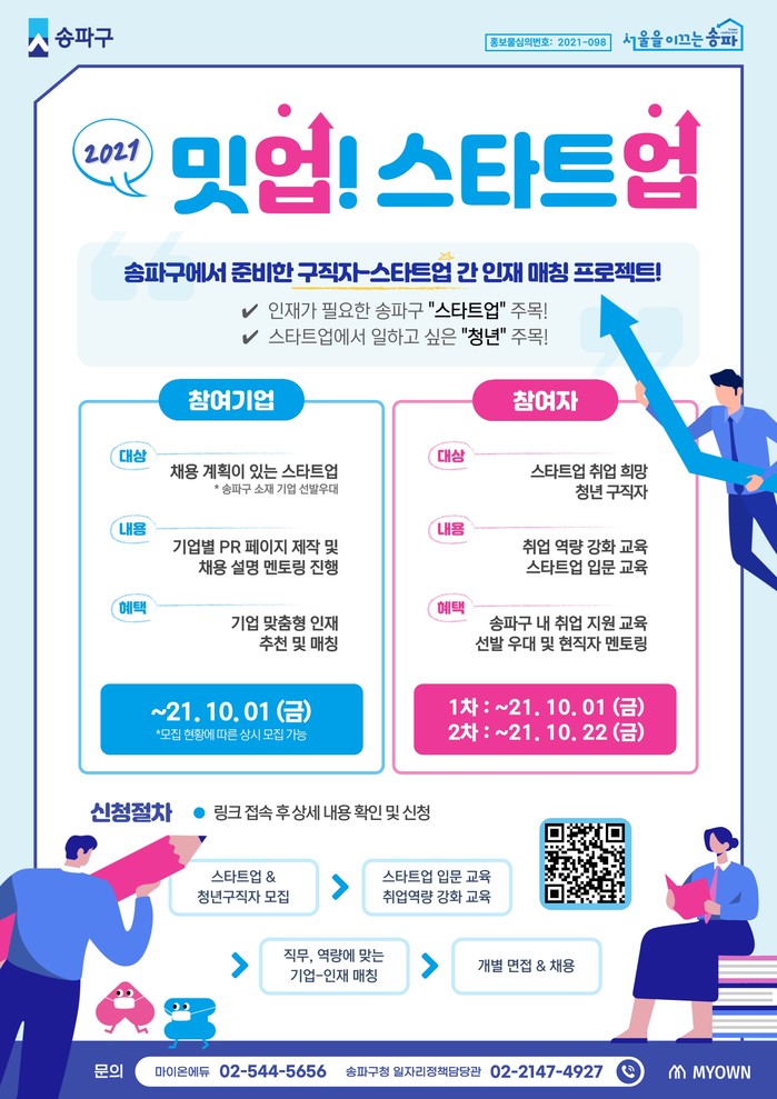 [시민일보 = 이대우 기자] 송파구(구청장 박성수)가 청년들의 취업난과 스타트업 기업의 구인난을 해소하기 위해 인재 매칭 프로그램 ‘밋업! 스타트업(meet up! start up)’을 오는 10월 한달간 운영한다.