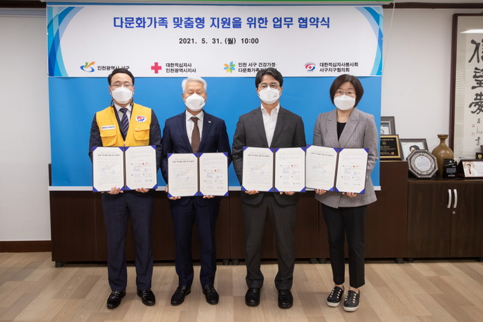 인천 서구가 31일 대한적십자사 인천광역시지사, 서구 건강가정·다문화가족지원센터 및 대한적십자봉사회 서구지구협의회와 다문화가족 맞춤형 지원을 위한 업무협약을 체결했다. 협약에 따라 구는 협약 기관들과 공동 협력해 지역내 1만1000여명의 다문화가족에게 교육지원, 문화지원 등 다양한 맞춤형 서비스를 제공한다. 사진은 협약 체결 후 이재현 구청장(오른쪽 두 번째)이 협약 기관 관계자들과 기념촬영을 하는 모습. (사진제공=인천 서구청)