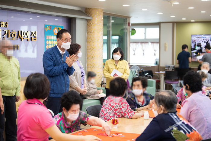 장세용 경북 구미시장이 최근 코로나19 확진자 증가에 따라 지난 30일 집단감염 취약시설인 구미간호사의집, 문성효마실주간보호센터 등 노인복지시설을 방문해 종사자들과 이용 노인들을 격려하고 방역지침 준수를 당부했다. 사진은 구미간호사의 집을 방문한 장 시장이 노인들에게 방역지침 준수를 당부하는 모습. (사진제공=구미시청)