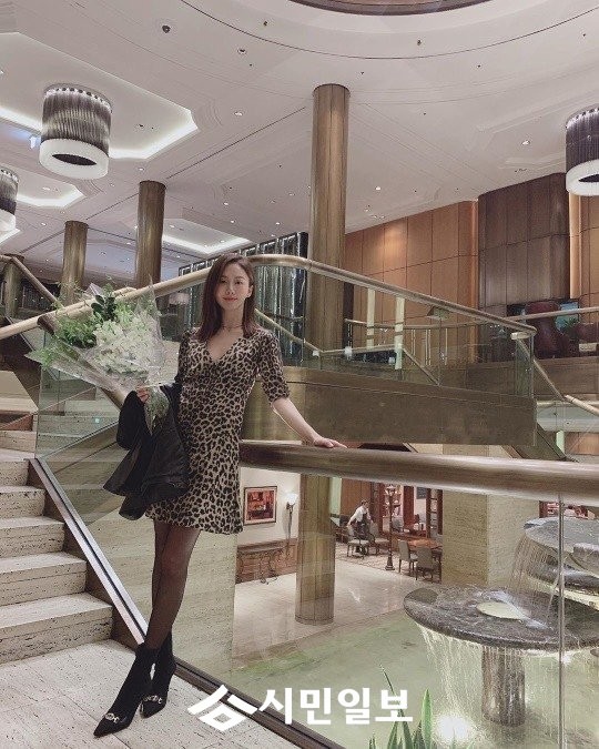 공개된 사진 속 고성희는 한 호텔 로비에서 레오파드 패턴의 원피스를 입고 포즈를 취하고 있다.
