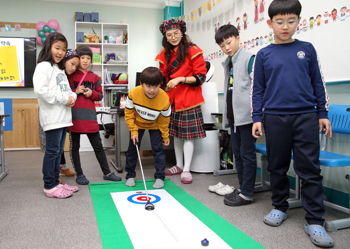 서울 금천구가 10일 오후 2~5시 서울시흥초등학교 신관 1층 시흥글로벌인재학당에서 초등학생을 대상으로 ‘세계문화체험-달라서 좋아요’ 행사를 개최했다. 사진은 스코틀랜드관에 참여하고 있는 초등학생들이 미니 컬링 게임을 즐기고 있는 모습. (사진제공=금천구청)