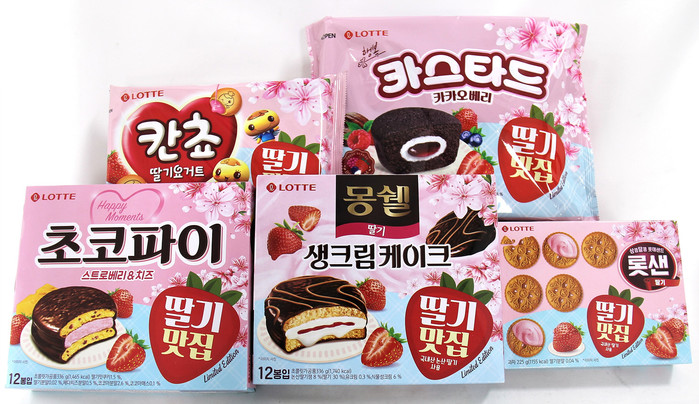 ‘초코파이 스트로베리&치즈’는 진한 치즈맛이 나는 파이 속에 딸기 쿠키칩을 넣어 씹히는 재미가 느낄 수 있고 딸기맛 마시멜로가 들어가 있다. ‘칸쵸 딸기요거트’는 비스킷 속에 딸기요거트 크림이 들어가 있다.
