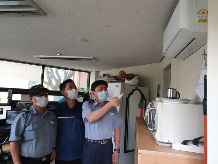 | ▲ 래미안세레니티 아파트 경비실에서 경비원이 설치된 에어컨을 켜고 있다. (사진제공=성북구청) |