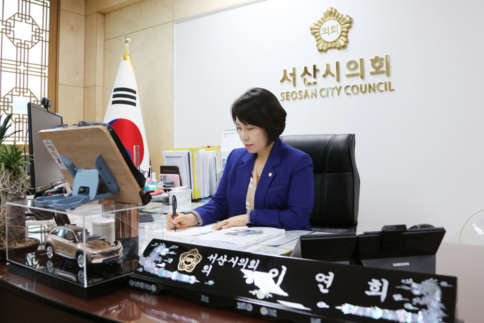 | ▲ 이연희 의장이 ‘진실·화해를 위한 과거사정리위원회’에 보낼 서한문을 작성하고 있다. (사진제공=서산시의회) |