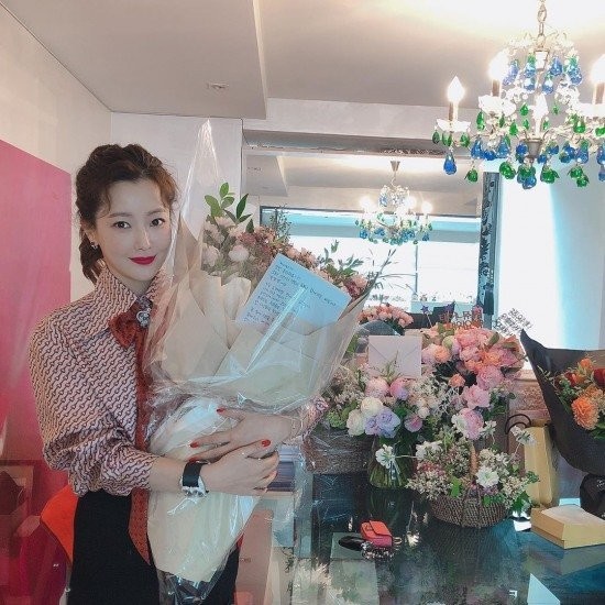 공개된 사진 속 김희선은 생일을 맞아 꽃다발을 손에 들고 살짝 웃고 있다.