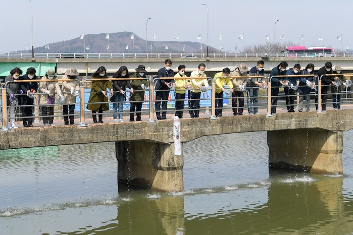 전남 순천시는 동천의 하천생태계 건강성을 확보하기 위해 3일 동천하류 세월교 인근에서 전라남도 해양수산과학원으로부터 지원받는 어린연어 5만마리를 방류했다. 사진은 이날 연어를 방류하고 있는 허석 시장(가운데)과 관계자들의 모습. (사진제공=순천시청)