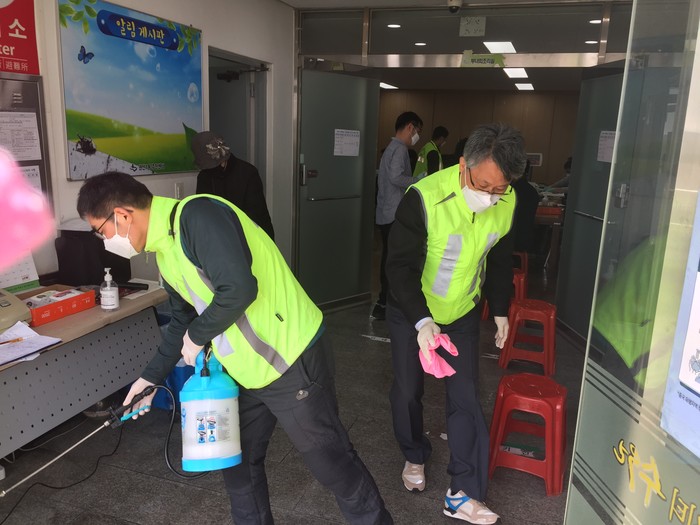 경기 수원시 권선구 권선1동 클린방역단과 수원농수산물유통로상인회는 6일 ‘생활 속 거리두기’로 전환되면서 코로나19 확산 방지를 위해 안심방역을 실시했다. 사진은 관계자들이 방역을 하고 있는 모습. (사진제공=권선구청)