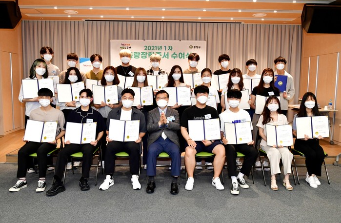 | ▲ 지난 6월22일 방정환교육지원센터에서 명문대 진학 장학생 29명을 대상으로 중랑 장학증서를 전달한 후 류경기 구청장(앞줄 가운데)이 학생들과 기념촬영을 하고 있다. (사진제공=중랑구청) |