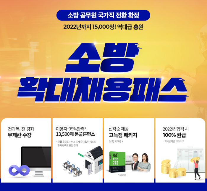 얼리버드 이벤트를 진행 중인 ‘소방 확대채용패스’도 다양한 혜택을 담고 있다. 비공개 기출 복원 ‘기출문제&해설자료’와 본고사급 문제로 실전 연습하는 ‘전과목 온라인 모의고사’, 면접 기출의 경향을 반영한 ‘온라인 면접 특강’ 등 소방 맞춤 학습 서비스를 지원한다.