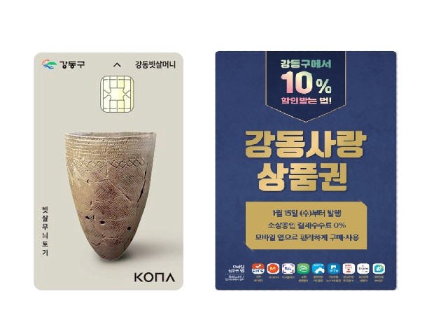 | ▲ 지난해 발행된 강동구 카드형 지역화폐 ‘강동빗살머니’와 모바일 지역화폐 ‘강동사랑상품권’. (사진제공=강동구청) |