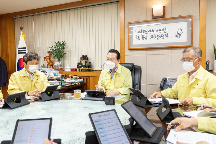 서울 강서구는 지난 14일 ‘추석 연휴 대책회의’를 열고 구민안전대책, 풍수해대책 등 7개 분야별 대응방안을 집중 점검했다. 사진은 이날 회의에서 노현송 구청장(가운데)이 관련 부서장들과 함께 논의를 하고 있는 모습. (사진제공=강서구청)