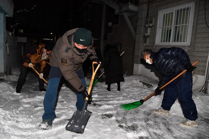 6일 갑작스러운 폭설로 주민 불편이 예상되는 가운데 경기 하남시가 전공무원을 투입해 제설작업에 총력을 기울였다. 사진은 김상호 시장(왼쪽)이 덕풍1동 주민들 및 공무원들과 눈을 치우고 있는 모습. (사진제공=하남시청)