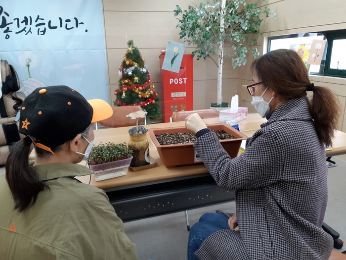현재, 2월분 활동키트 구성은 1차 운동요법(스마트 훌라후프)·심리지원(콩나물키우기키트), 2차 원예요법(새싹키우기키트)·집중력 향상(퍼즐)·구급상자 등으로 대상자가 가정에서 2주 단위로 맞추어 프로그램이 진행 되었다.