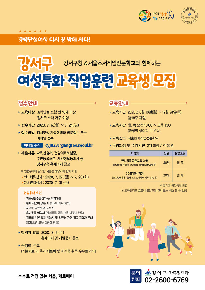 이에 따라 구는 취업과 창업을 준비하는 여성들을 대상으로 '강서구 여성특화 직업훈련 과정’을 개설하고 오는 24일까지 참가자를 모집한다.