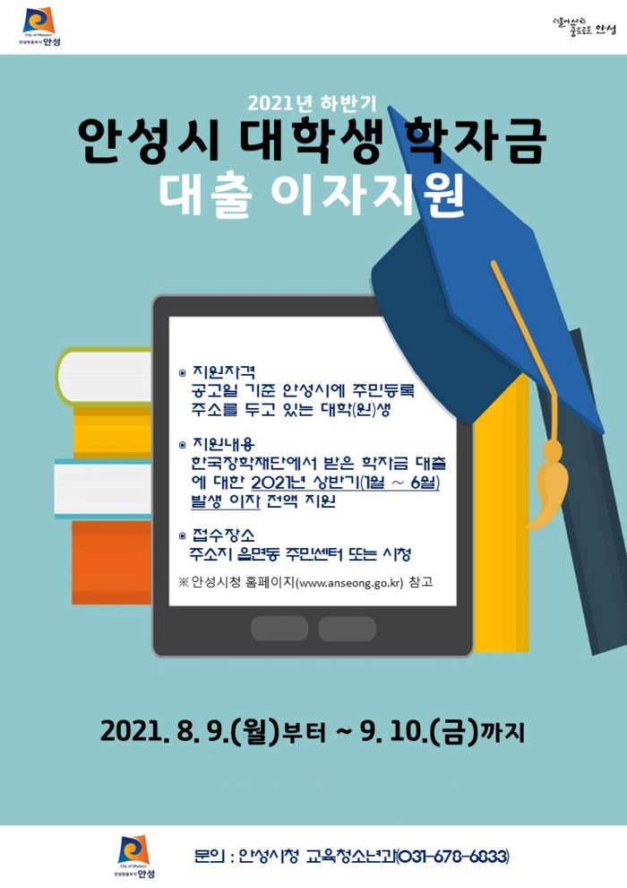 [안성=오왕석 기자] 안성시는 오는 9일부터 9월 10일까지 2021년도 하반기 안성시 대학생 학자금 대출이자 지원신청을 받는다고 밝혔다.