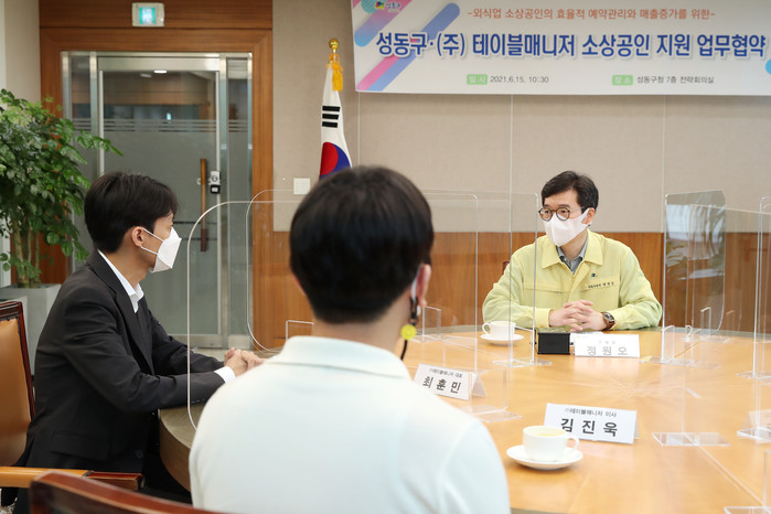 | ▲ 지난 6월 외식업 소상공인 지원을 위한 (주)테이블매니저와의 업무협약식에서 정원오 구청장(왼쪽)이 관계자들과 사안에 대해 논의를 하고 있는 모습. (사진제공=성동구청) |