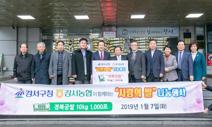 서울 강서구는 7일 구청 앞마당에서 ‘사랑의 쌀 나눔행사’를 개최, 강서농업협동조합으로부터 어려운 이웃을 위한 10kg 쌀 1000포를 기탁받았다. 사진은 노현송 구청장(왼쪽에서 다섯 번째)과 농협 관계자들이 기념촬영을 하는 모습. (사진제공=강서구청)