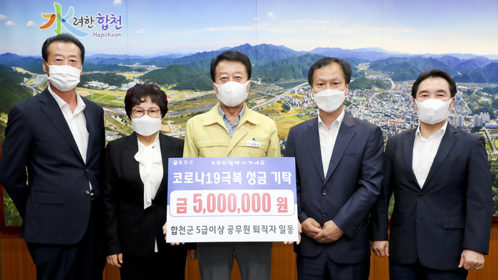 합천군(군수 문준희)은 지난 17일 합천군 5급 이상 공무원 퇴직예정자(이규학 기획감사실장, 김임종 경제건설국장, 이재호 덕곡면장, 강신미 삼가면장, 이덕구 용주면장)들이 합천군청을 방문해 코로나19로 어려움을 겪고 있는 군민들을 위해 써 달라며 500만원을 기탁했다고 밝혔다.
