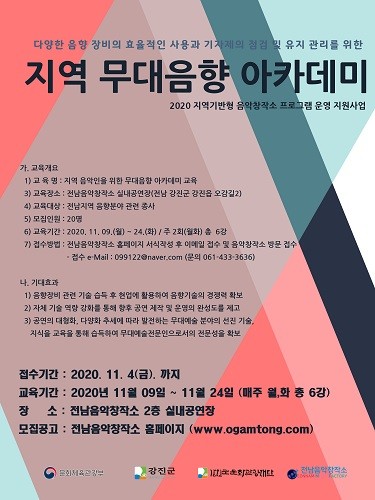 ‘2020년 지역 무대음향 아카데미’는 11월 9일부터 매주 월, 화요일 오후 7시에 3주간 운영될 예정이다.