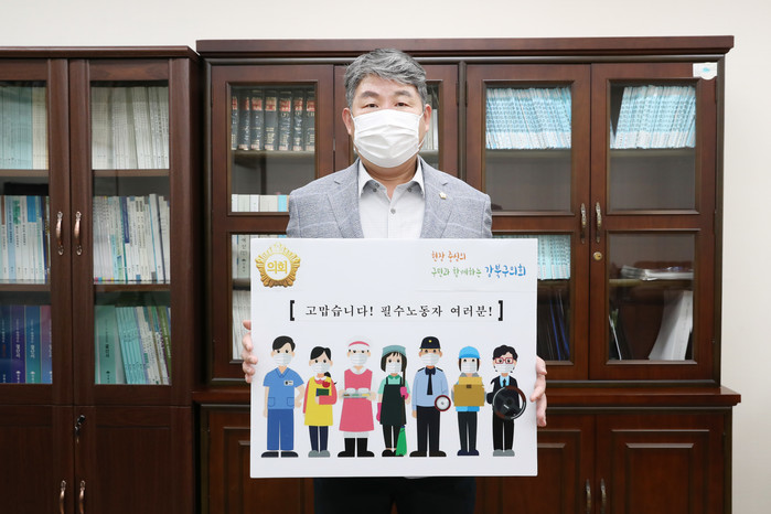이 부의장과 최 의원은 강북구의회 이용균 의장의 지목을 받아 각각 ‘고맙습니다! 필수노동자 여러분!’이 적힌 팻말을 들고 챌린지에 참여했다.