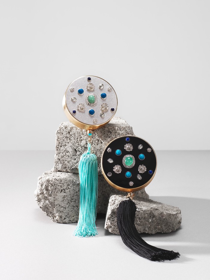 실제 반지, 목걸이의 패션 요소로 활용되는 유색석과 다양한 장식 요소들을 가미해 화장품 용기가 아닌 패션 아이템의 느낌을 준다.