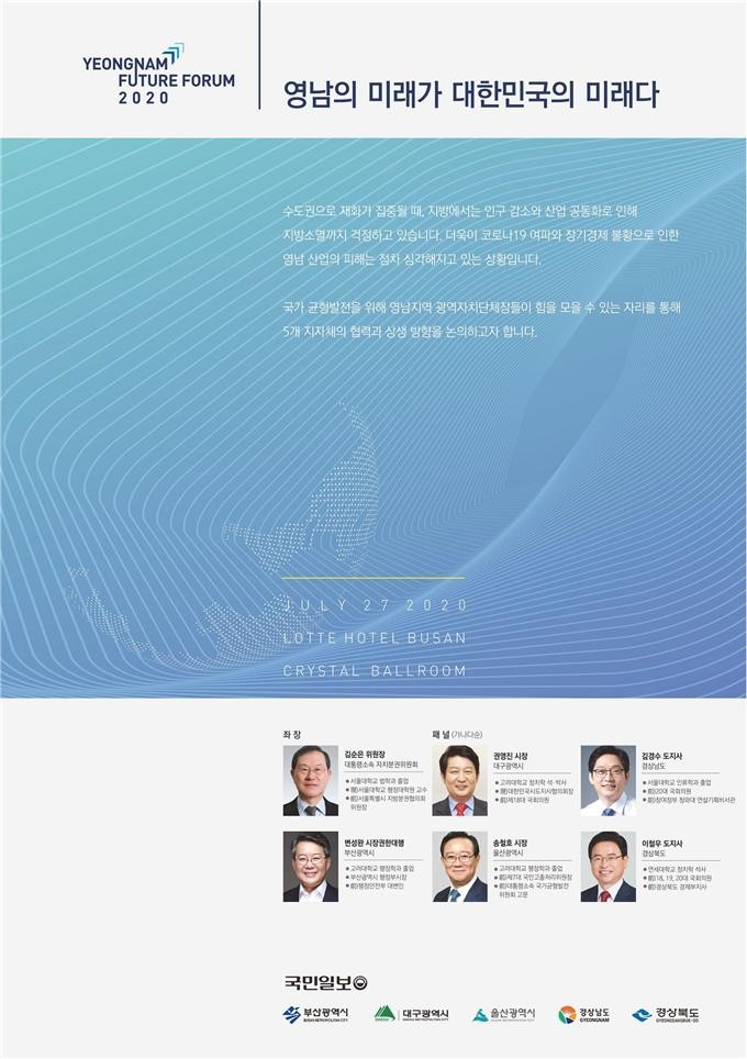 변성완 부산시장 권한대행, 권영진 대구시장, 송철호 울산시장, 이철우 경북도지사, 김경수 경남도지사가 7월 27일 오후 2시 부산 롯데호텔에서 열리는 「2020 영남미래포럼 – 영남의 미래가 대한민국의 미래다」에 참석한다.