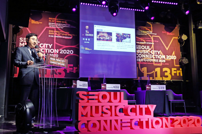 이동진 서울 도봉구청장이 최근 플랫폼창동61 레드박스 공연장에서 진행된 국제컨퍼런스 ‘서울뮤직시티커넥션2020 -세계 음악도시를 통한 도시재생’에서 기조연설을 했다. 사진은 이 구청장이 ‘음악도시 창동의 계획과 글로벌 음악도시 서울의 미래’를 주제로 연설을 하는 모습.(사진제공=도봉구청)