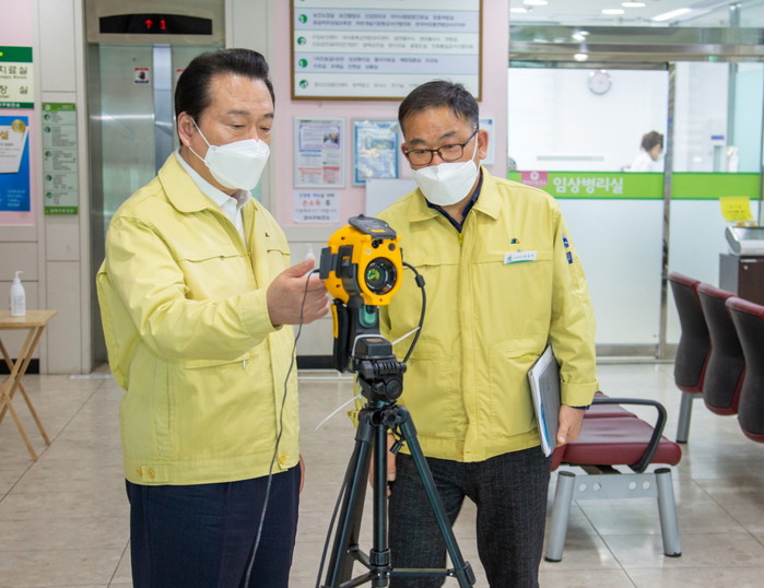 노현송 강서구청장은 3일 우한폐렴 확산에 대비해 선별진료소가 설치된 구 보건소를 방문해 비상대응체계를 점검하고 보건행정과장으로부터 대응 현황을 보고받았다. 사진은 노 구청장(왼쪽)이 열화상카메라 작동 여부를 살펴보는 모습. (사진제공=강서구청)
