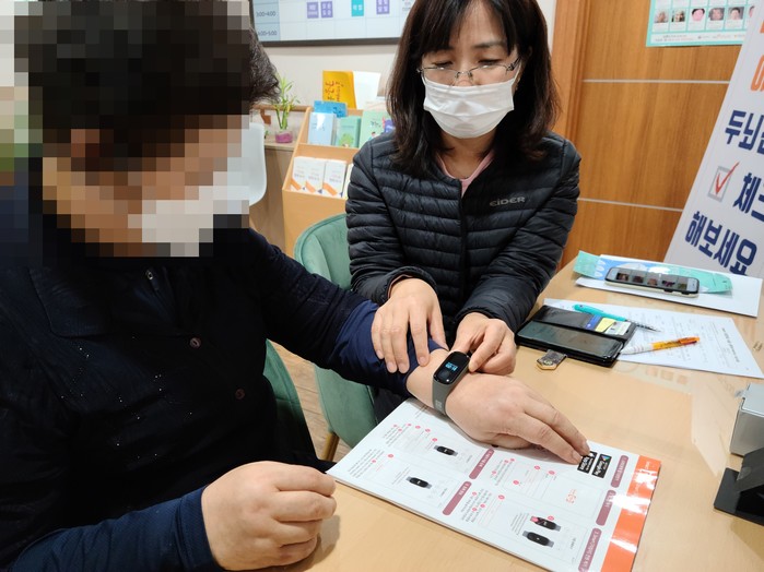 | ▲ 치매안심센터 관계자가 지난 27일 노인에게 스마트지킴이 사용법을 안내하고 있다. (사진제공=관악구청) |