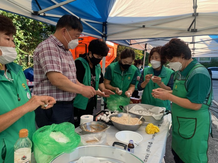 경기 포천시 소흘읍새마을회는 15일 추석을 맞아 '사랑의 떡 나눔' 행사를 진행해 지역내 소외된 이웃에 가래떡(약 200kg)과 송편(50상자)을 전달했다. 사진은 이날 봉사자들이 송편을 빚고 있는 모습. (사진제공=포천시청)