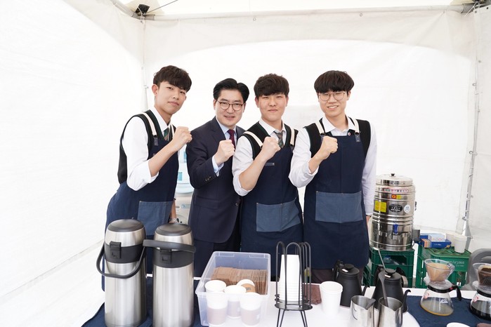 이정훈 서울 강동구청장은 23일 구청 앞마당에서 박람회는 ‘내일(Job)을 잡(Job)아라!’라는 슬로건으로 진행된 ‘2019 강동 취업박람회’에 참석해 현장을 둘러봤다. 사진은 이 구청장(왼쪽에서 두 번째)가 행사 참가자들과 함께 기념촬영을 하고 있는 모습. (사진제공=강동구청)