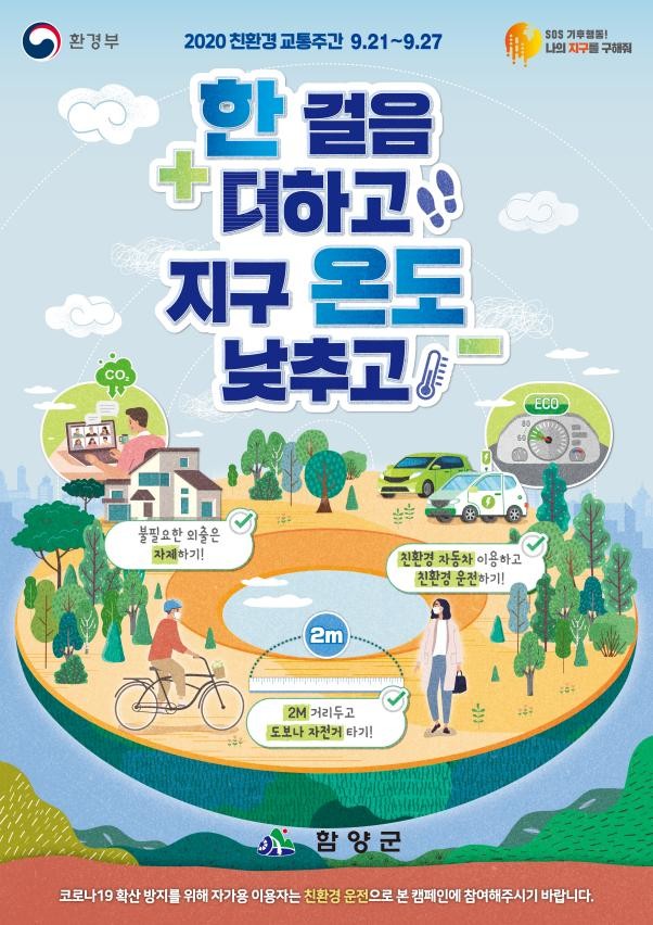 함양군(군수 서춘수)은 ‘세계 차 없는 날(9월 22일)’을 맞아 자발적 녹색교통 운전문화 확산을 위해‘한걸음 더하고 +, 지구온도 낮추고 -’란 주제로 21일부터 27일까지 7일간‘친환경 교통주간’을 운영한다.
