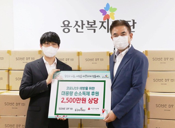 서울 용산복지재단은 최근 (주)페렌벨의 자연주의 스킨케어 브랜드 썸바이미(SOME BY MI)로부터 지역 소외계층을 위한 대용량 손소독제 1920개(2500만원 상당)를 기부받았다. 사진은 기탁식에서 변형석 페렌벨 대표(왼쪽)와 관계자가 기념촬영을 하는 모습. (사진제공=용산구청)