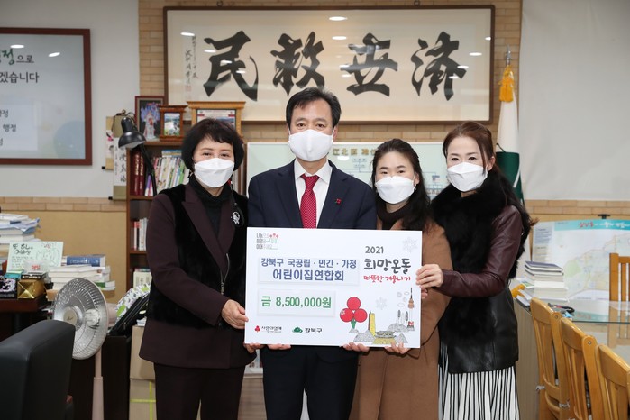 서울 강북구는 지난 15일 국공립어린이집·민간어린이집·가정어린이집연합회로부터 회원들이 자발적으로 모은 총 850만원의 따뜻한 겨울나기 성금을 전달받았다. 사진은 박겸수 구청장(왼쪽에서 두 번째)과 관계자들이 기념촬영을 하는 모습. (사진제공=강북구청)
