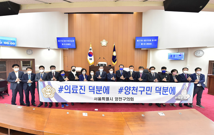 한편 구의회는 이날 1차 본회의를 마친 후 양천구의회 의원들은 국민참여형 캠페인 ‘덕분에 챌린지’에 동참했다. 의원들은 엄지손가락을 치켜든 수어동작을 하며 코로나19 극복에 전념하고 있는 의료진과 사회적 거리두기 등 생활방역을 적극 실천하고 있는 양천구민을 향해 존경과 감사의 마음을 전했다.