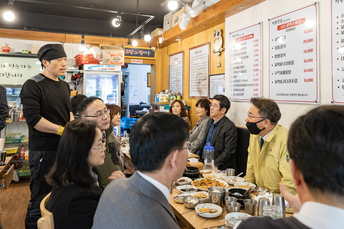 김선갑 서울 광진구청장은 9일 구청 간부 30여명과 함께 코로나19 확진자가 다녀간 화양동에 위치한 식당을 찾아 점심식사를 했다. 이 식당은 지난 2월29일 코로나19 확진자가 다녀간 동선이 공개 된 뒤 매출이 줄어 어려움을 겪었다. 사진은 김 구청장이 식당 주인과 이야기를 나누는 모습. (사진제공=광진구청)