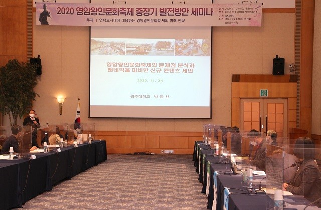 세미나에는 김창수 경기대학교 교수 등 축제 전문가 10명, 김한남 왕인문화축제위원장을 비롯한 영암군 향토축제추진위원, 대행기획사, 관계 공무원 등 총 20여 명이 참석한 가운데 생활 속 거리두기 지침을 철저히 준수하며 진행됐다.