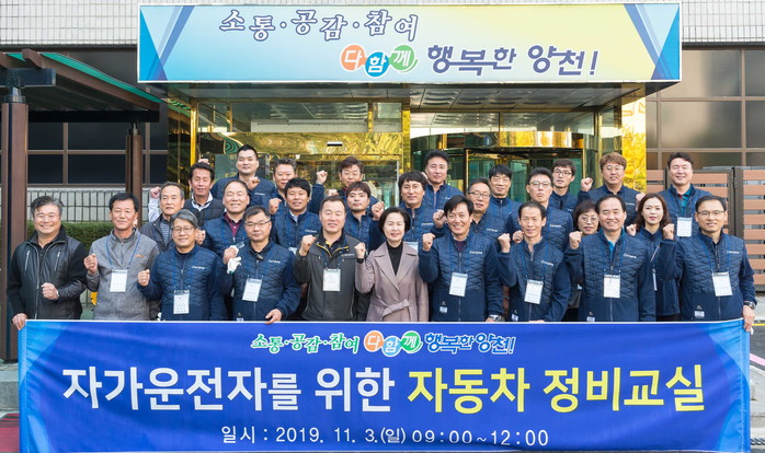 지난 3일 김수영 서울 양천구청장이 양천홀과 후정 주차장에서 열린 자동차정비교실에 참석해 “응급상황에 보다 능동적으로 대처할 수 있도록 강화된 이번 교육에 적극적으로 참여해 주시기를 바란다”고 말했다. 사진은 김 구청장(앞줄 오른쪽 다섯 번째)이 강사들과 기념사진을 찍고 있는 모습. (사진제공=양천구청)
