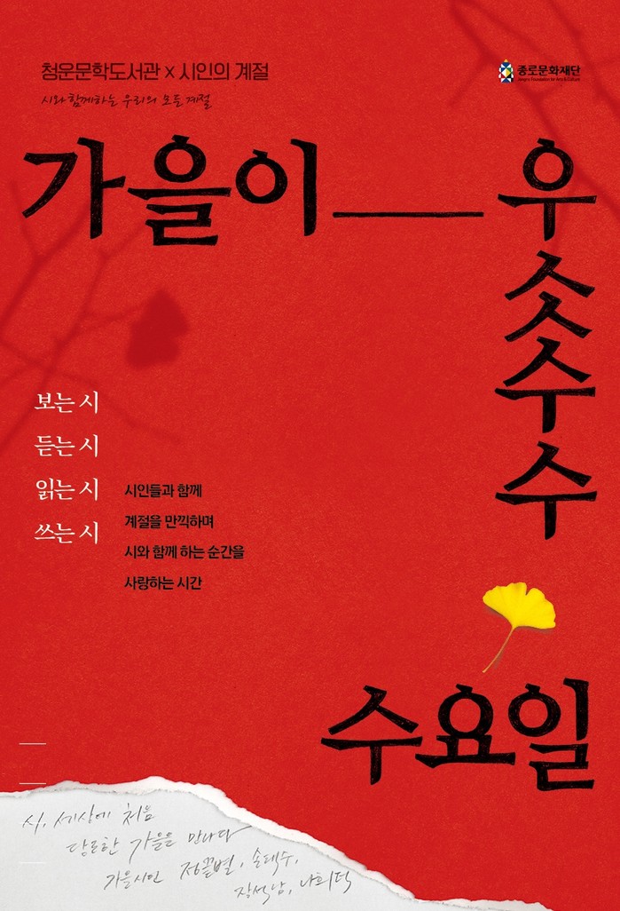 [시민일보 = 이대우 기자] 서울 종로구(구청장 김영종)는 오는 12월2일까지 매주 수요일 청운문학도서관(자하문로36길 40) 한옥세미나실에서 시인과 함께하는 '가을이 우수수수 수요일' 프로그램을 운영하고 있다.