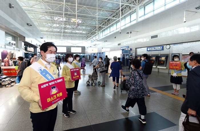 안병용 경기 의정부시장은 24일 ‘자생단체 사회적거리두기 캠페인’ 현장을 방문해 회원들의 노고를 격려하고 코로나 확산방지를 위한 캠페인 활동에 동참했다. 이날 캠페인은 호원권역 통장협의회 등 자생단체 회원들과 함께 주민통행이 많은 회룡역 주변을 순회하며 2단계로 강화된 사회적 거리두기 생활수칙 준수를 당부하는 방식으로 전개됐다. 사진은 안 시장(맨 왼쪽)이 캠페인을 진행하는 모습. (사진제공=의정부시청)