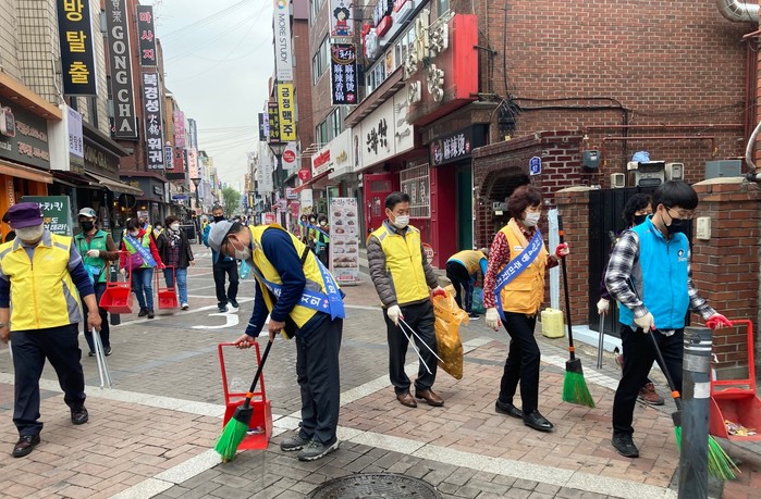 서울 광진구 자양4동 주민센터가 최근 자양4동 주민자치회 및 각 직능단체 회원들과 안전하고 깨끗한 마을을 위한 ‘마을 환경정비 및 코로나19 방역활동’을 실시했다. 사진은 이날 참여한 봉사자들이 거리를 청소하고 있는 모습. (사진제공=광진구청)
