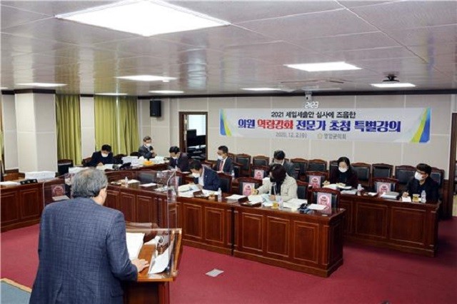 | ▲ 영암군의회가 지난 2일, 2021년 세입세출예산안의 내실 있는 심의를 위해 전문가를 초빙해 특별 강의를 받고 있다. / 영암군의회 제공 |