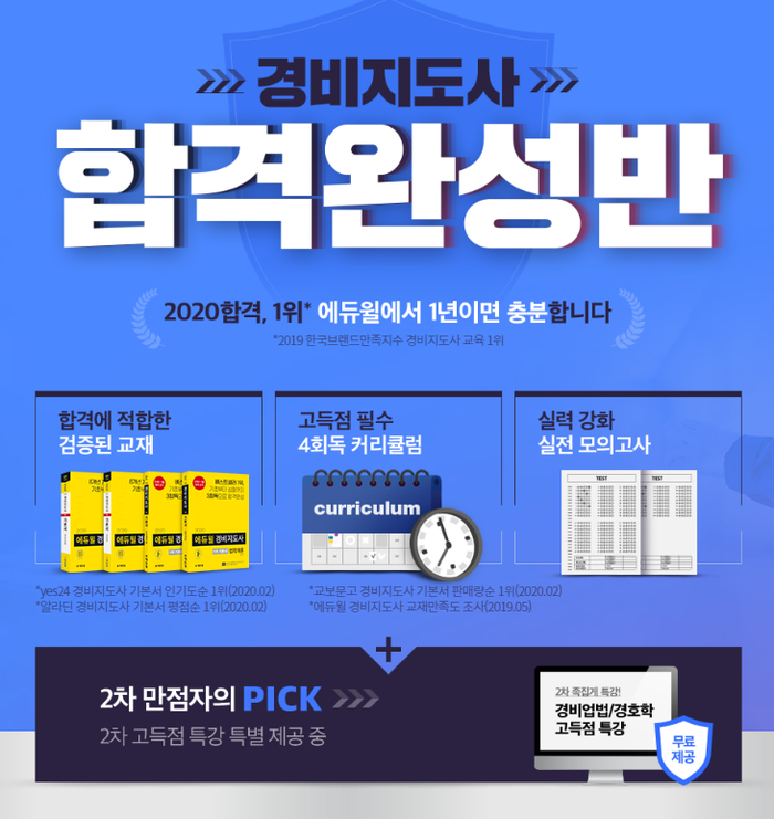 또한 고득점 확보가 필수인 2차 시험 상대평가에 확실한 대비를 위해 ‘경비업법/경호학 고득점 특강’을 무료로 이용할 수 있는 특별혜택도 제공한다.