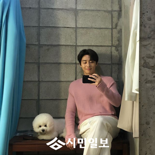 공개된 사진 속에서 박서준은 반려견의 옆에 앉아 카메라로 셀카를 찍고 있다.